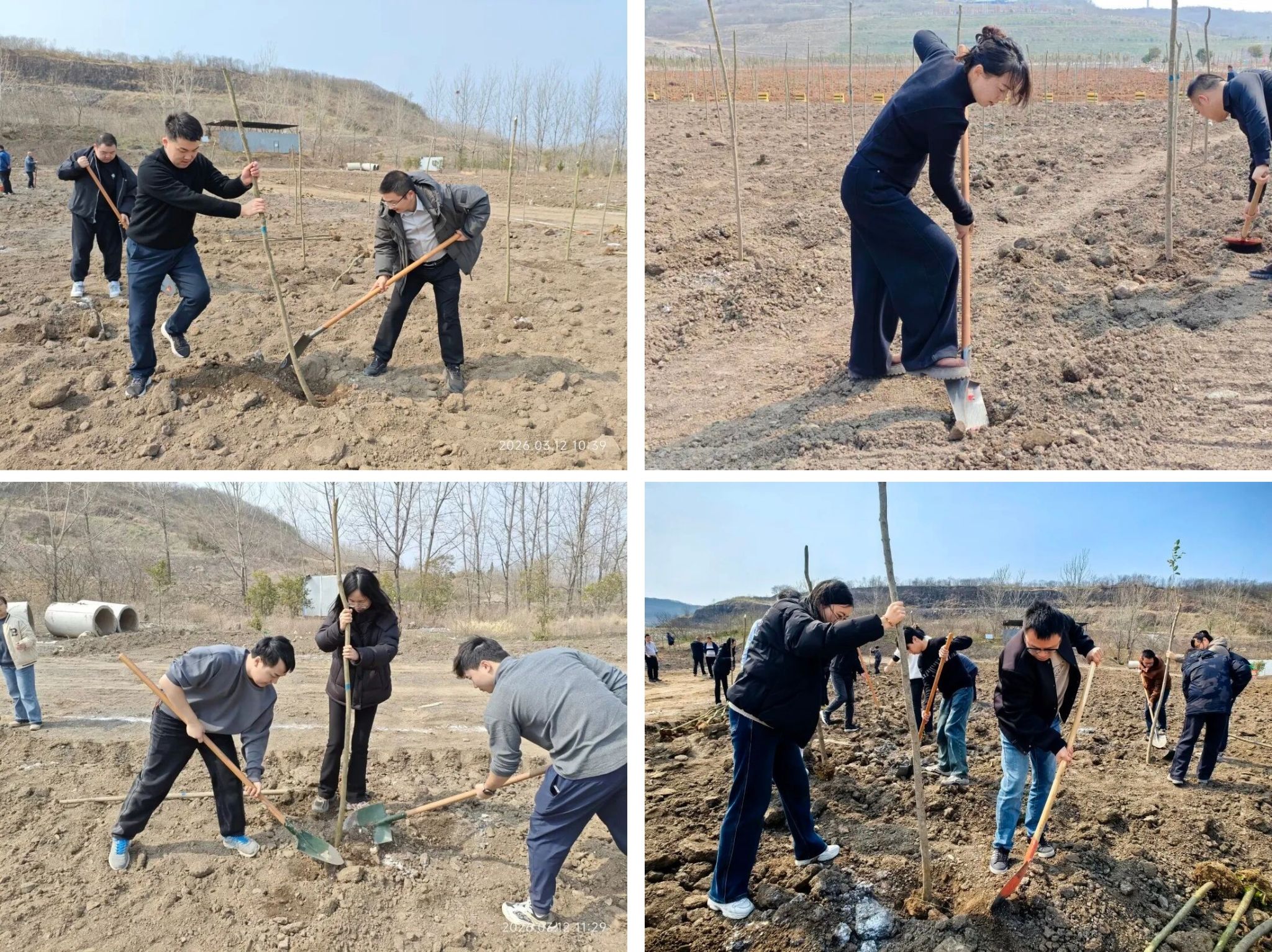 植树现场呈现出一派热火朝天的劳动景象。大家热情高涨、干劲十足,分工合作、配合默契,挥锹铲土、扶苗定根、细心培土、提水浇灌,每个环节都有条不紊、衔接紧密。